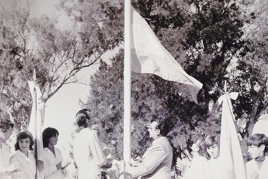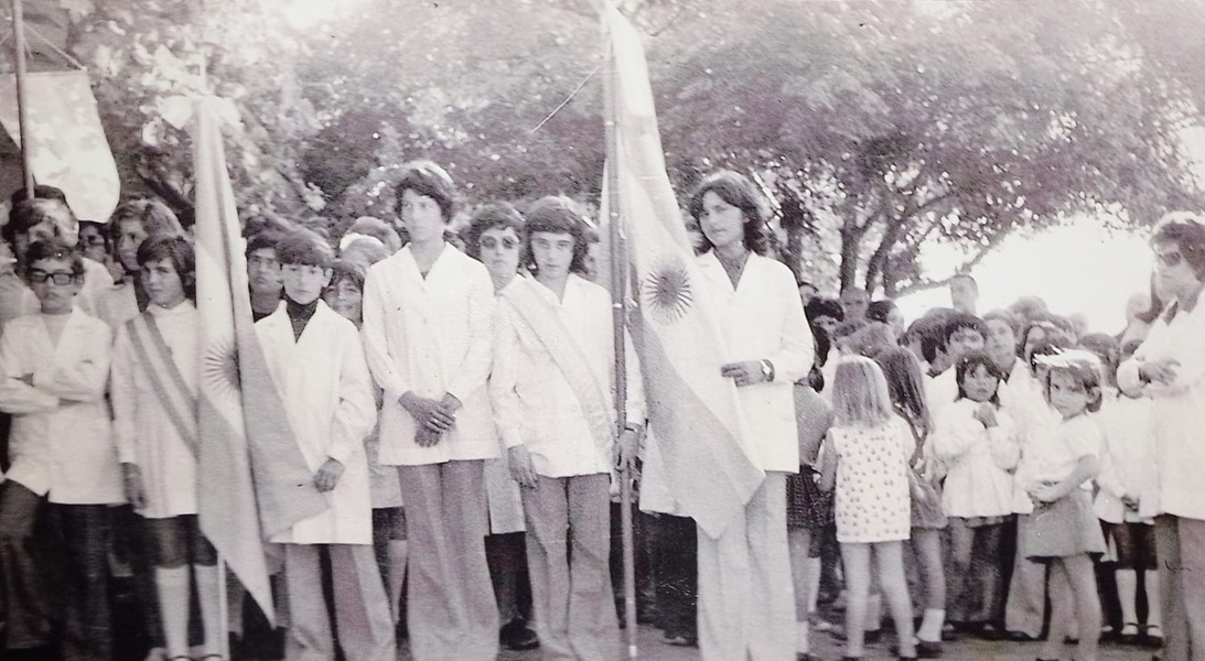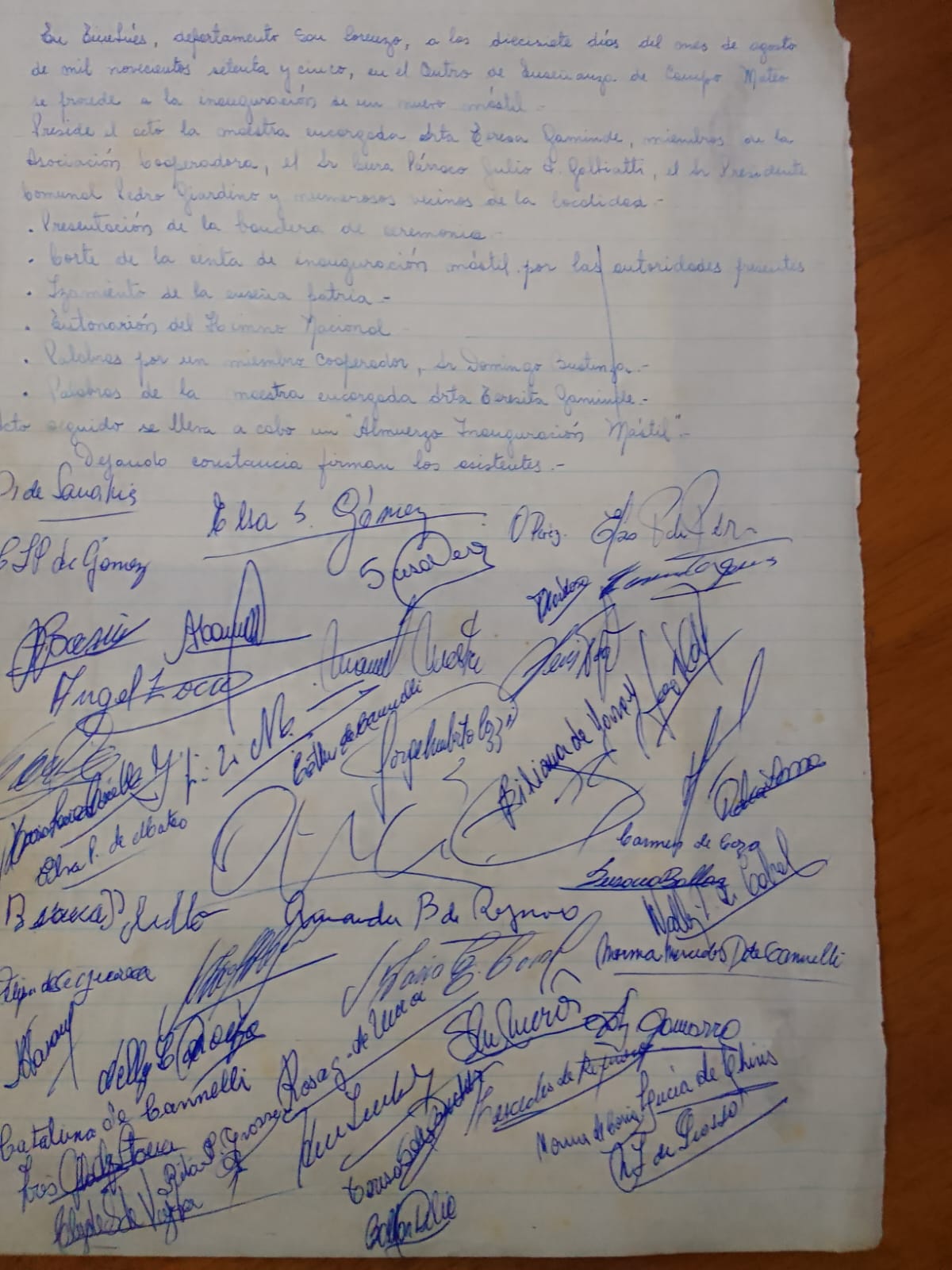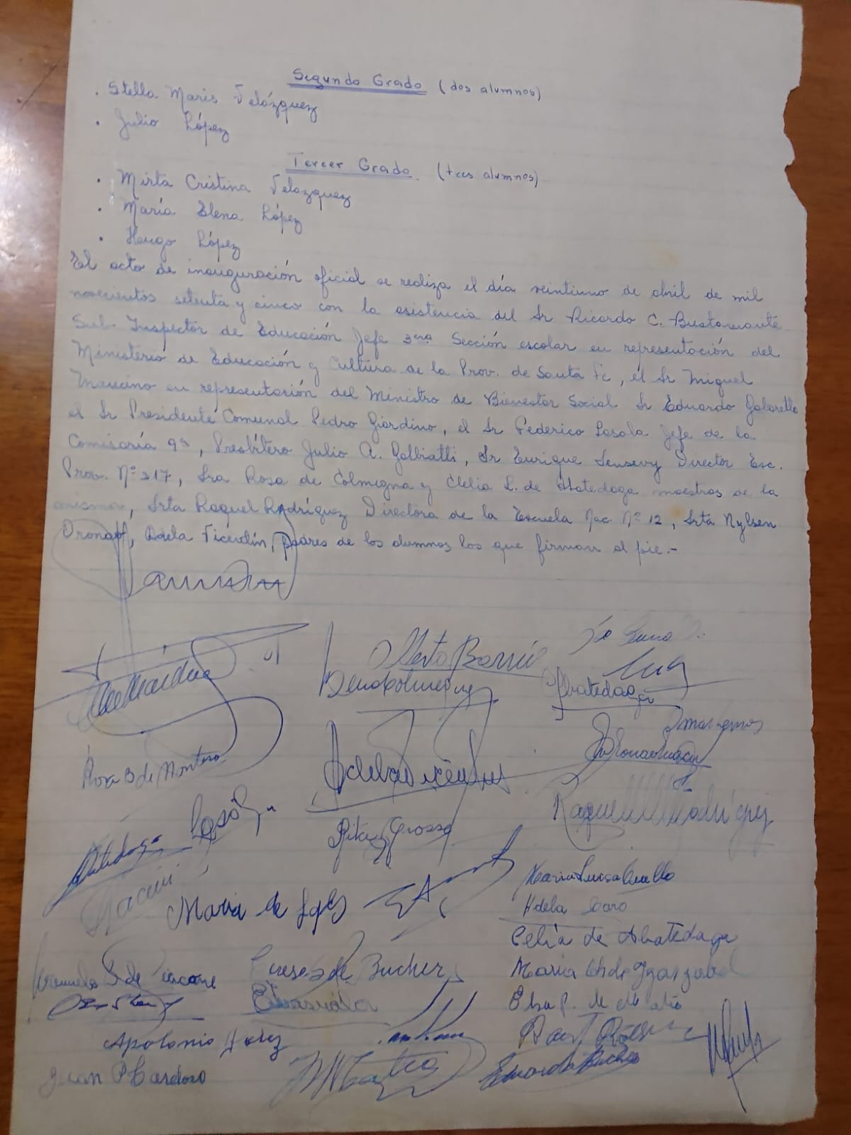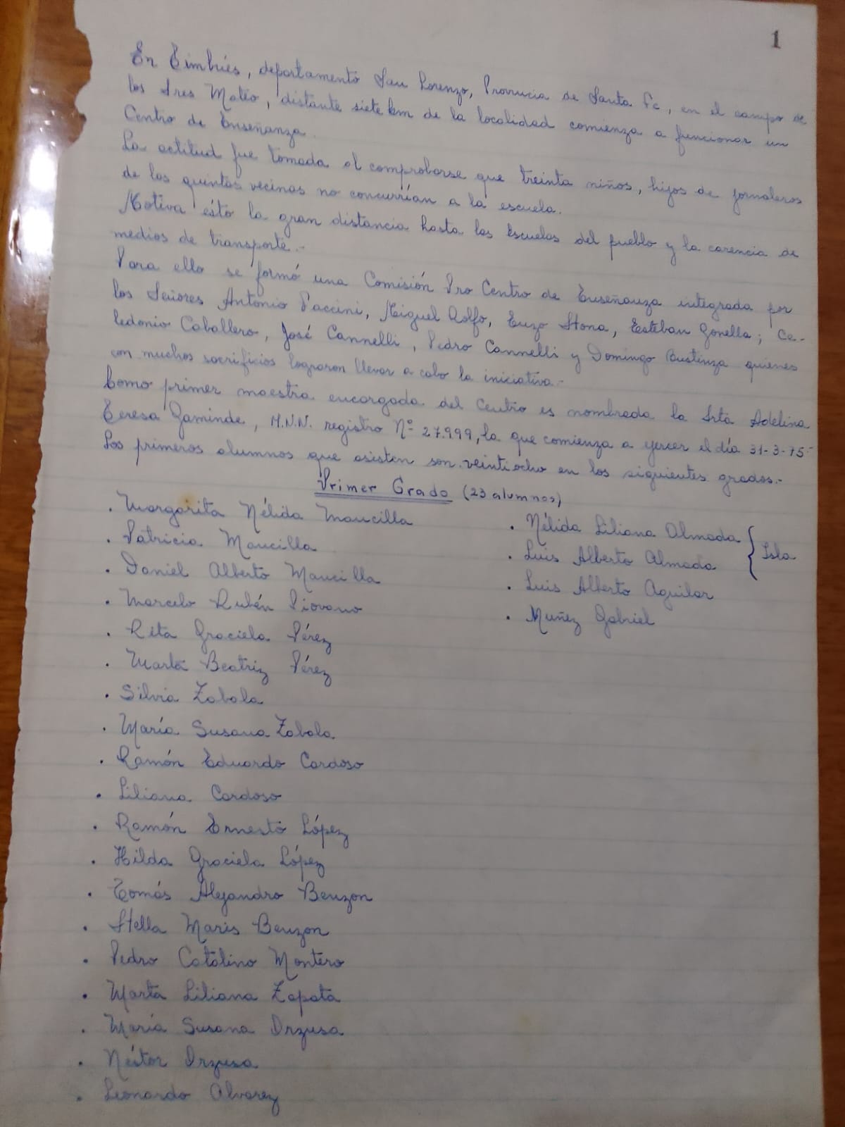 'La actitud fue tomada al comprobarse que 30 niños, hijos de jornaleros de las quintas vecinas no concurrían a la escuela. Motiva esto la gran distancia hasta las escuelas del pueblo y la carencia de medios de transporte. Para ello se formó una comisión pro centro de enseñanza integrada por los Sres. Antonio Faccini, Miguel Rolfo, Enzo Stona, Esteban Gonella, Celedonio Caballero, José Cannelli, Pedro Cannelli y Domingo Bustinza quienes con mucho sacrificio lograron llevar a cabo la iniciativa. Como primera maestra encargada del centro es nombrada la Srta. Adelina Teresa Gaminde, M: N: N: registro N.º 27.999, la comienza a ejercer el día 31/03/75. Los primeros alumnos que asisten son 28 en los siguientes grados: (1er grado): Margarita Nélida Mancilla, Patricia Mancilla, Daniel Alberto Mancilla, Marcelo Rubén Piovano, Rita Graciela Pérez, Marta Beatriz Pérez, Silvia Zabala, María Susana Zabala, Ramón Eduardo Cardoso, Liliana Cardoso, Ramón Ernesto López, Hilda Graciela López, Tomás Benzon, Stella Maris Benzon, Pedro Catalino Montero, Marta Liliana Zapata, María Susana Orzusa, Néstor Orzusa, Leonardo Alvarez, Nélida Liliana Almada, Luis Alberto Almada, Luis Alberto Aguilar, Gabriel Núñez. (2do. grado) Stella Maris Velázquez, Julio López (3er grado): Mirta Cristina Velazquez, María Elena López, Hugo López. El acto de inauguración oficial se realiza el día 21 de abril de 1975 con la asistencia del Sr. Ricardo C. Bustamante sub inspector de educación jefe 3ra. sección escolar en representación del Ministerio de Educación y Cultura de la Provincia de Santa Fe, el Sr. Miguel Maucino en representación del Ministerio de Bienestar Social, Sr. Eduardo Galaretto, el Sr. Presidente Comunal Pedro Giardino, el Sr. Federico Losada Jefe de La Comisaría 9na. Presbítero Julio Galbiatti.Sr. Enrique Sensevy Dr. Escuela Provincial N° 217, Sra. Rosa de Colmegna y Clelia de Abatedaga maestras de la misma, Srta Raquel Rodríguez Dra. de la escuela Nacional N.º 12 Srta. Nilsen Oronao, Adela Vicentín, y padres de los alumnos. Todas aquellos que vivieron ese momento están invitados a compartir sus recuerdos...'
